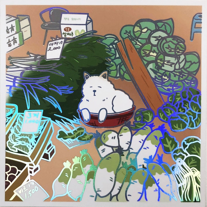 “One night, aimlessly scrolling on Twitter, I stumbled across a photo of this dog seemingly in charge of a vegetable stall at a street market. Zooming into the paper signs to read the writing, I realized the market was in Korea, and this was maybe even a Jindo dog. It’s always a funny feeling encountering something Korean when you least expect it, like seeing a familiar face. The photo made me nostalgic for summers in Korea, walking through a market with a fresh-squeezed kiwi juice pouch in hand. I’ve never been lucky enough to see a perfect scene like this in real life, though—it feels like a scene from a dream, like my memories of Korea.”