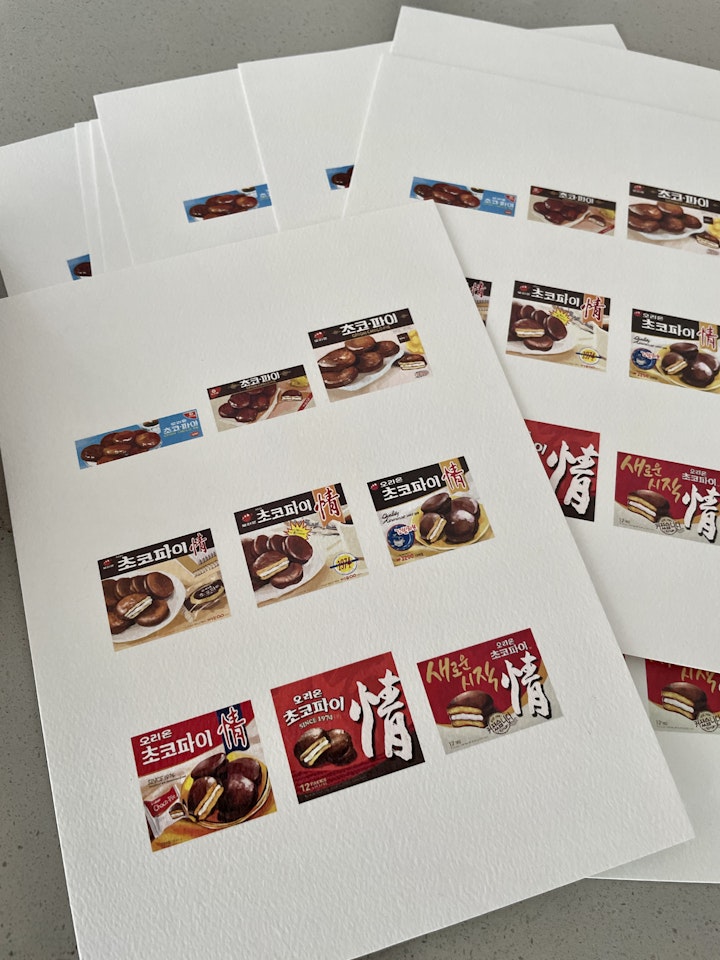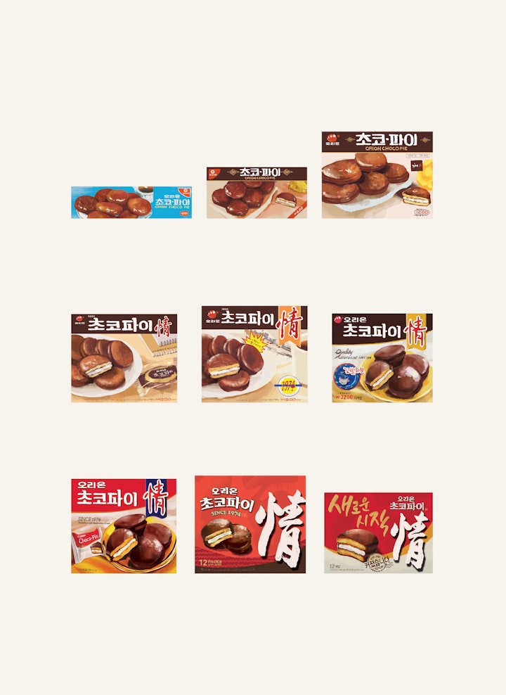 “I digitally painted these different versions of Orion’s Choco Pie products from the 1970s, 80s, 90s, early 2000s, to 2010, and today—and found it fascinating to see how the sizes and numbers of the Choco Pies on the box got smaller while the character “jeong” got bigger. On the most recent box of Choco Pie, the “jeong” character is almost half the size of the box, with a single isolated Choco Pie cast into its shadow.