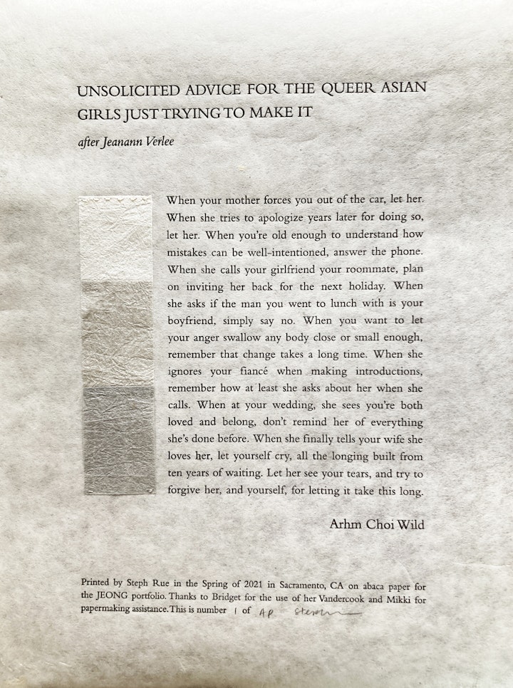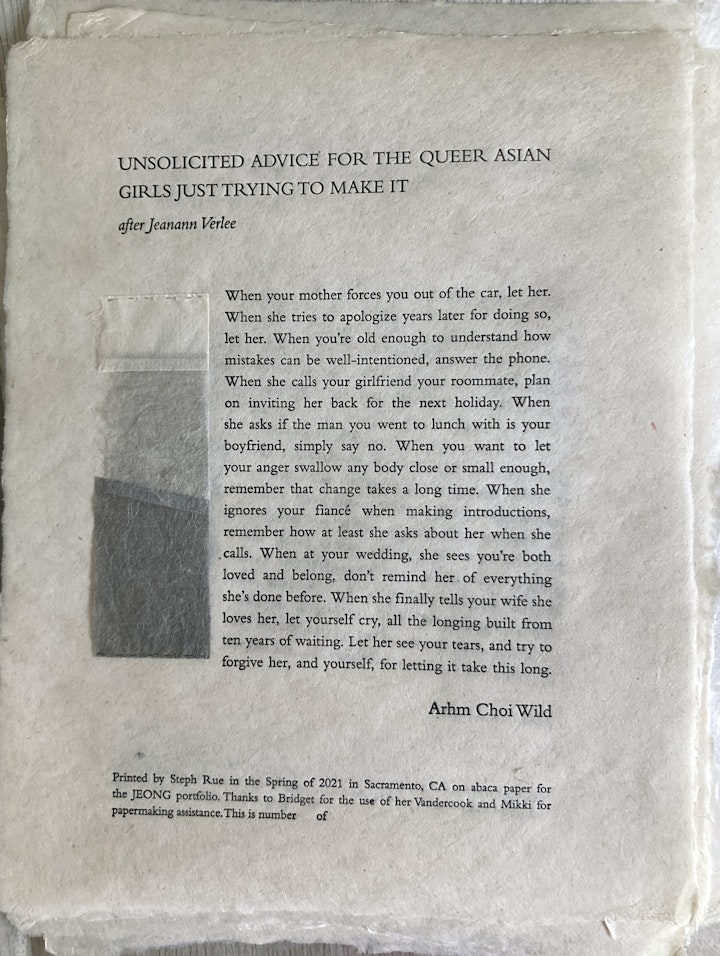 “In May, I made paper out of abaca in my backyard with Mikki Paek. In June, I printed Arhm’s poem on the paper at Bridget Lewis’s letterpress shop. Over the summer, I pieced tiny scraps of hanji together and stitched them to the paper. I consider this work to be a true collaboration with each of these fellow artists, with the poem, and with the materials and process, which allowed me to sit and reflect on these words for many days and nights.”