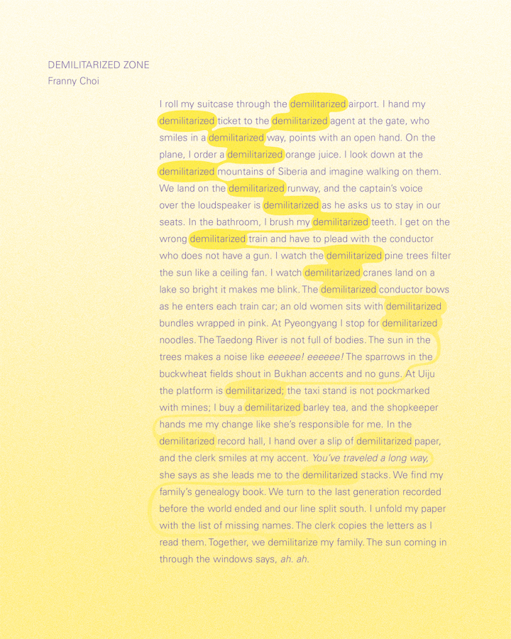 “In the poem Demilitarized Zone by Franny Choi, the narrator is on a journey. As the narrator moves from place to place, the flow of simple, sometimes beautiful moments is described, but through a repetitious lens that disrupts and complicates the experience. In designing for this poem, I tried to use a simple typesetting and subtle graphic overprint to represent this journey, and to express a hope for the dismantling of boundaries that keep us apart.”